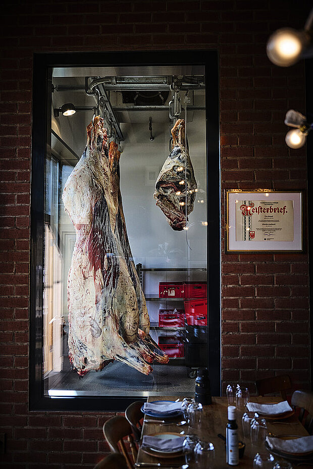 Die Arbeit und die Mühe eines Rinderhalters sollten nicht vergebens sein, nur weil der Metzger an der Reifezeit gespart hat. Wir empfehlen daher eine Reifezeit von mindestens 21 Tagen, bevor das Fleisch zerlegt und konsumiert wird. Unsere gläsernen Kühlräume sind auf 2 Grad und 85% Luftfeuchtigkeit eingestellt und garantieren somit eine saubere, trockene Reifung am Knochen. (Dry-Aged)